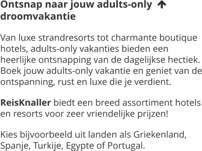 Adults only vakantie 2026: Ontdek de mooiste bestemmingenOp vakantie staat ontspanning voorop. Maar zonder kinderen om je heen is dat nét even anders. Adults only betekent letterlijk: alleen voor volwassenen. En dat merk je meteen zodra je kiest voor een vakantie zonder kinderen. Tuurlijk, kinderen brengen leven in de brouwerij maar juist tijdens een vakantie voor volwassenen vind je de rust die je zo hard nodig hebt. Geen gespetter in het zwembad, geen jengelende kinderen, niemand die je aandacht opeist. Kortom: tijdens een adults only-vakantie is het tijd voor je perfecte vakantie